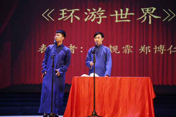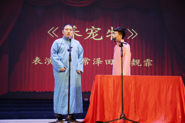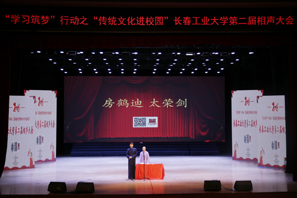 的大三学生,从小喜爱相声,曾受相声教育家王祥林等先生的指点,曾登上2017年吉林省草根春晚的舞台。这一次他和搭档为观众表演了三段相声,特别是新作《环游世界》(传统相声名为《地理图》)的大贯口功底深厚、一气呵成,让在场观众大呼过瘾。最后登场的房鹤迪、太荣剑老师的底活则让大家见识到相声演员的真功夫。整台演出真可谓是“传统文化进校园,博大精深真体验,说学逗唱技艺精,欢声笑语掌声连”。
