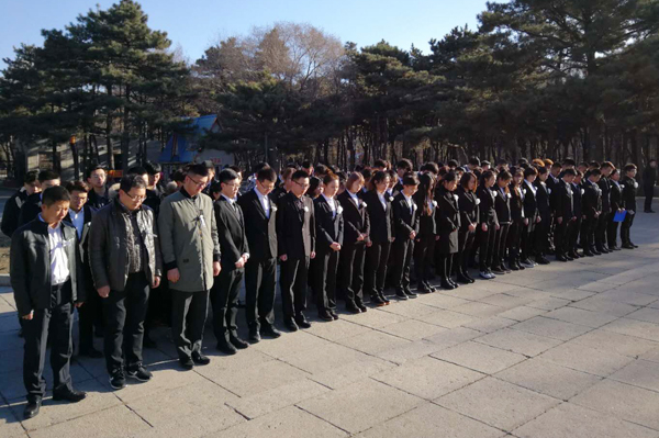 在长春解放纪念碑前,师生队伍井然有序、安静肃穆,全体默哀、鞠躬,向长眠在这里的革命英烈致以深切的哀悼,表达最崇高的敬意。