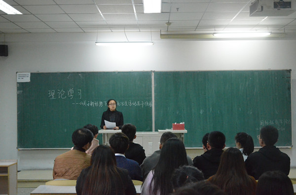 直属党支部在2017年11月1日于南湖校区教学科研楼2107组织召开了支部党员理论学习会。本次会议由辅导员李守瑶主持,新青年理论协会负责人孔庆研主讲,h视频
