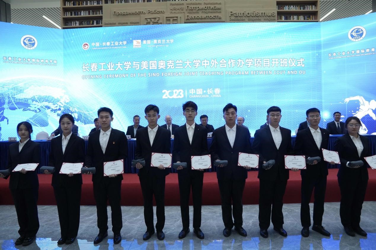 仪式上学院对2023年度在科技创新活动取得突出成绩的张晋宁等13名“科技标兵”以及张馨月等31名“科技能手”予以表彰。在场领导为受表彰的同学颁发证书和美国奥克兰大学为获奖同学准备的纪念品。