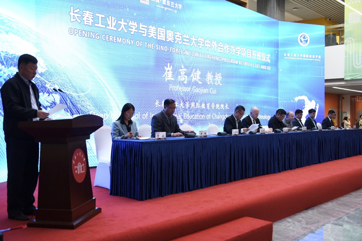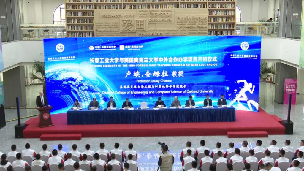 与美国奥克兰大学中外合作办学项目2023年开班仪式在北湖西区举行。副校长王二辰,美国奥克兰大学工程与计算机科学学院院长卢埃·查姆拉、国际部主任盖瑞·巴博尔和院长助理杨连祥,h视频